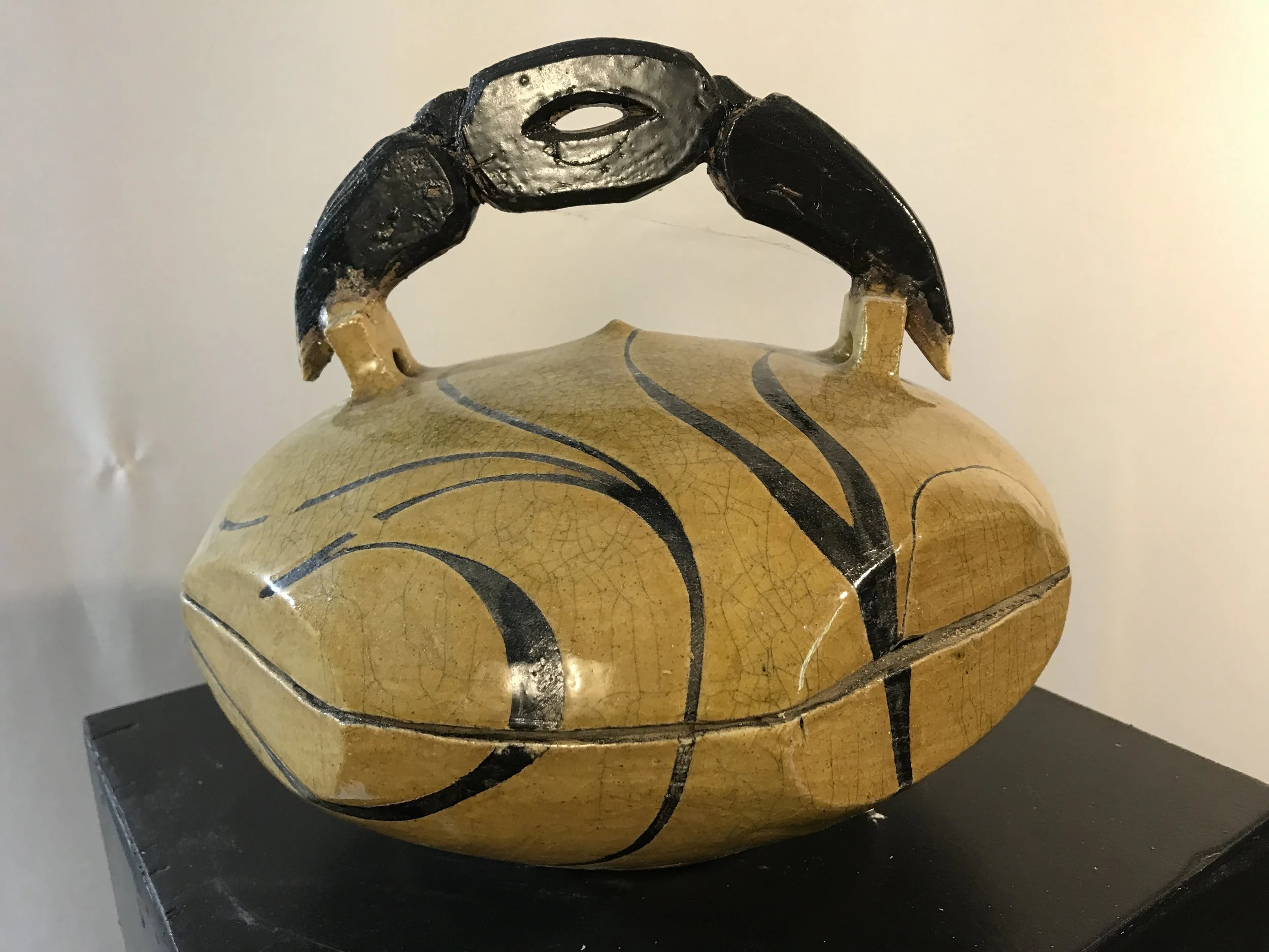 Joel Moses, "Kisbah container," Raku fired with an African influenced design. 10 inch diameter x 11 inch height