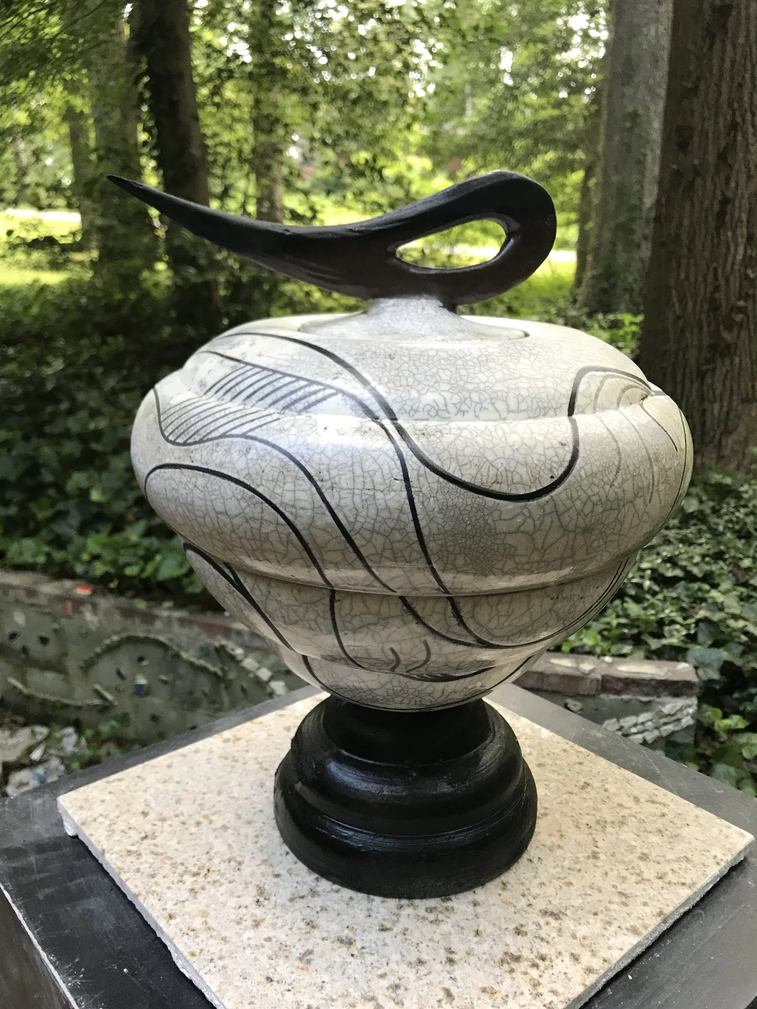 Joel Moses, "Double walled container," Raku fired with a taped resist design, 12 inch diameter x 14 inch height