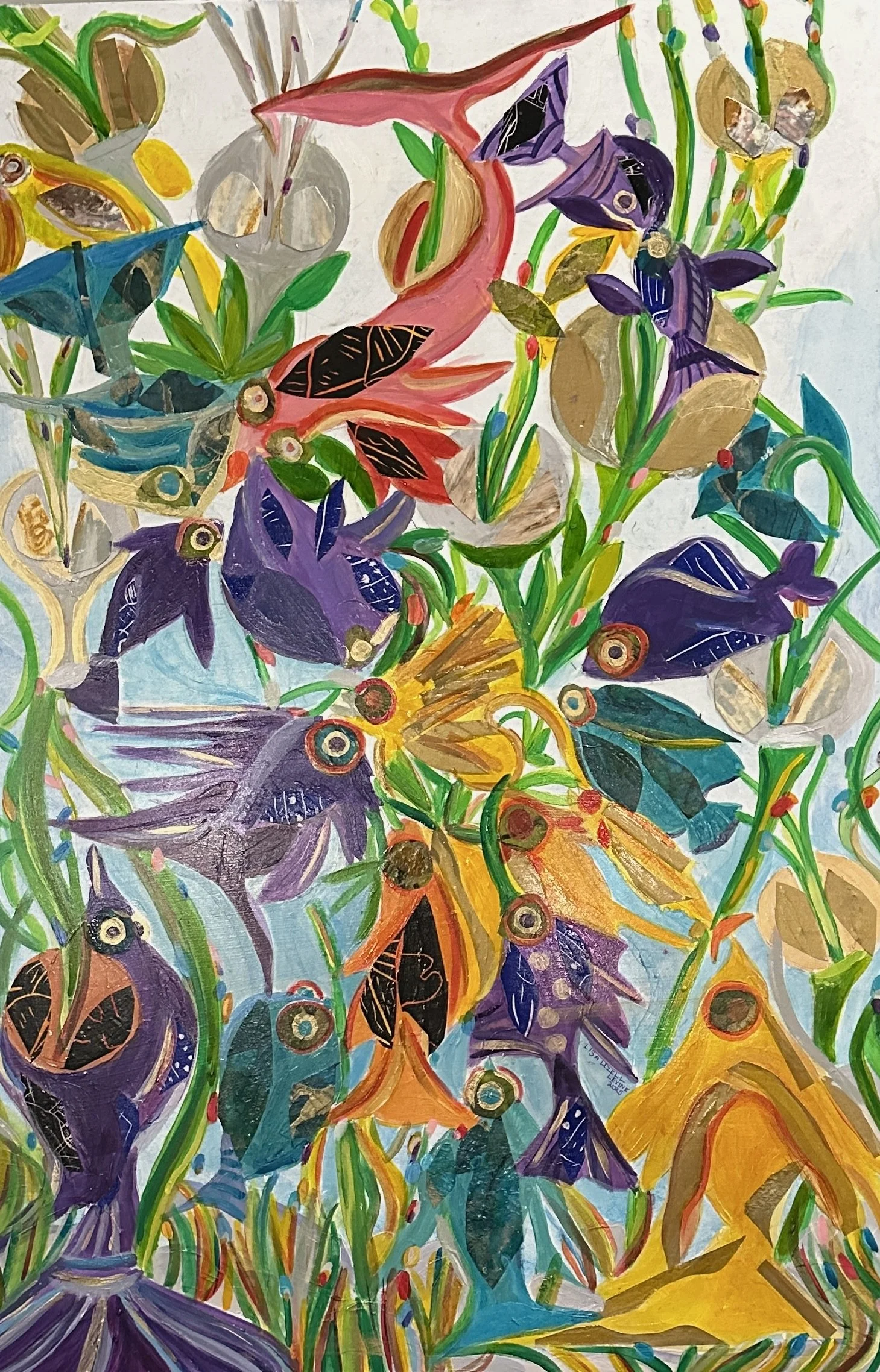 "Vibrant Fish 1", Acrylic and Collage, 24 X 36 inches