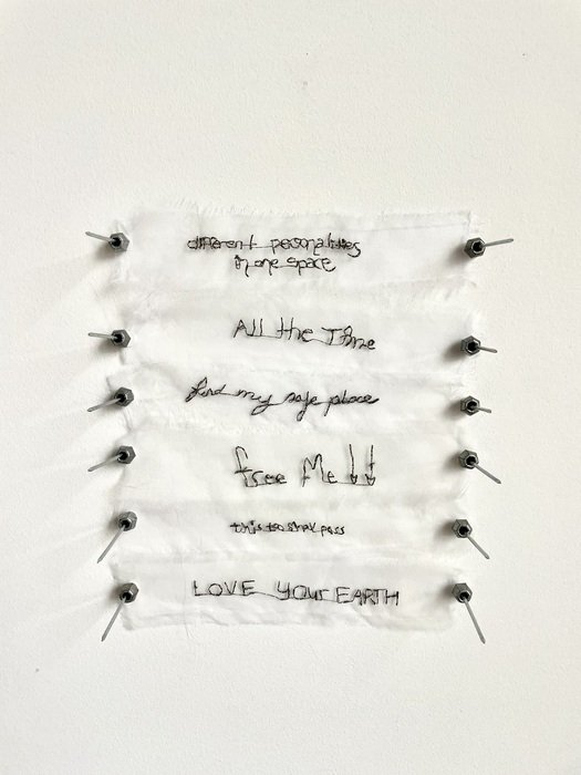 Thread on peace silk, nails, metal nuts, 10.5” x 9” x 3”, 2026