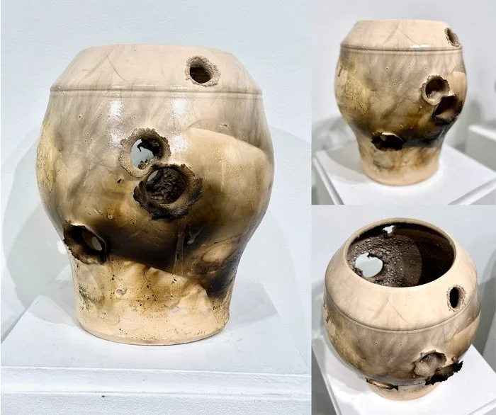 Ceramic vessel shot with 9mm handgun at 15 yards, 16” x 14” x 14”, 2025