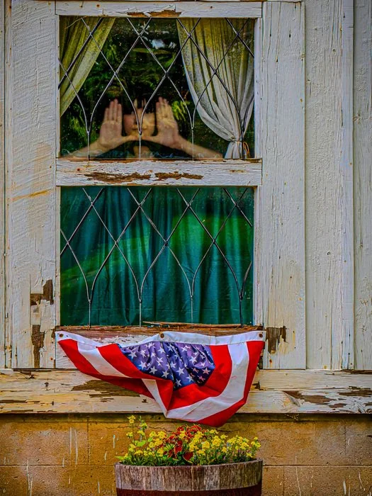 For one quarter of a century, the American experiment has been defined not only by unity, but by the constant tension between belonging, protest, and the right to speak. The photographs in these images explore that tension through ordinary spaces where this story quietly unfolds. In one image, a weathered window frames unseen hands pressed against glass, the American flag draped below like a fragile promise. The gesture suggests both presence and distance—an immigrant gaze looking outward while still held apart. In another, a monumental flag interrupts a wall of street art and protest imagery, surrounded by voices of culture, memory, and dissent. All images in my series, "America: A Work in Progress", ask a simple question: Who gets to claim the American voice? Patriotism and protest share the same visual space, revealing a nation still negotiating its ideals. Freedom, after all, is not a fixed symbol—it is an ongoing act of expression.
