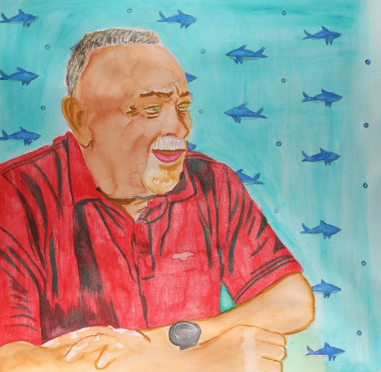 April Painter, "Richard, at Tía's Birthday Dinner," 2023, 24 x 24 in., watercolor on paper.