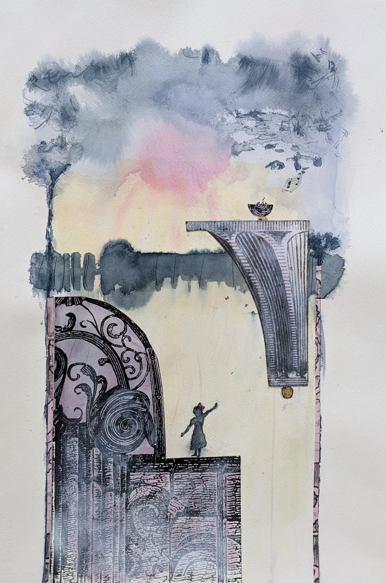 Vickyle Payton, "Musical Muse #1; Ravel (Princess)," 2023, 17 x 12 in., watercolor, bits of old music, gold foil ginkgo leaf.