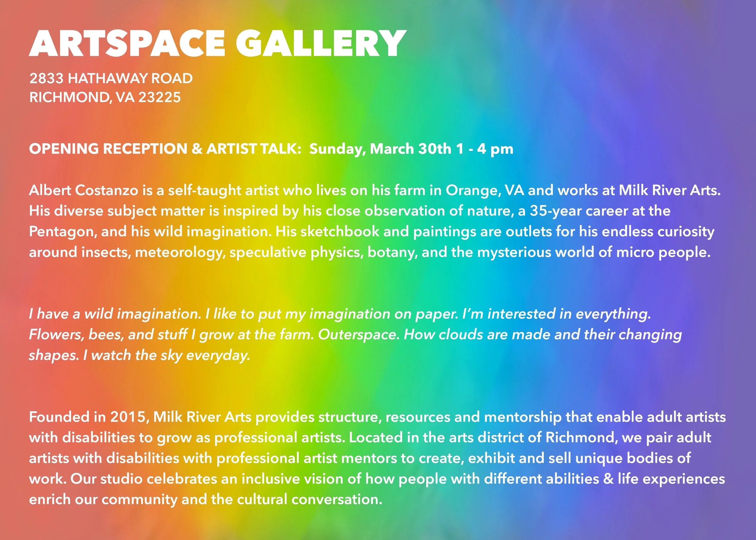 Artspace presents an exhibition from March 28 - April 19, 2025. The opening reception, scheduled for Sunday, March 30, 2025, 1:00-4:00pm, features artwork by Albert Costanzo curated by the Richmond nonprofit Milk River Arts.